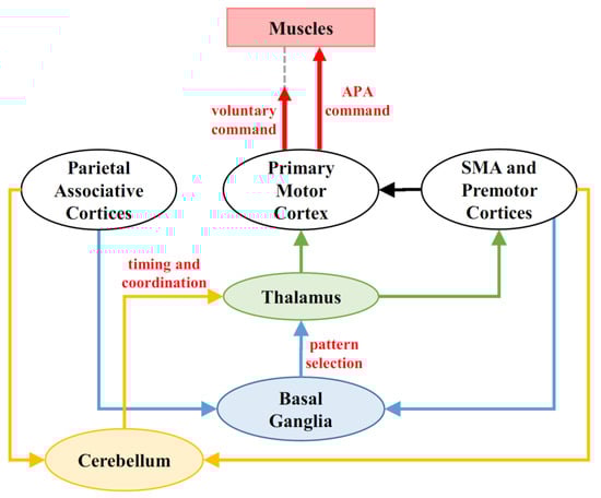 Despite the different classification, inter- and intra-limb APAs share similar control mechanisms. Indeed, APAs create fixation chains in several muscles to avoid the destabilization produced by the reaction forces. As mentioned above, APAs revert in sign when movement direction is reverted [33,40] and adapt to changes in the postural context and also in movement speed [48,49,50]; moreover, they have an important link with the movement precision [34,51]. Besides the kinematic aspects, inter- and intra-limb APAs also share the same neural structures. The involvement of Primary Motor Cortex (PMC) in both inter- [52] and intra-limb APAs has been studied [33]. For example, the inhibition of PMC through transcranial magnetic stimulation on the left M1 induced a delay of the APA onset in the contralateral Latissimus Dorsi muscle while the subject abducted his left arm [53]. Even the Supplementary Motor Area (SMA) has been correlated to the modulation of APAs. In fact, during a bimanual task, patients suffering unilateral SMA lesion showed impaired inter-limb APAs in the forearm contralateral to the lesion [54]. Furthermore, a study carried out with the transcranial direct current stimulation highlighted the role of SMA in modifying intra-limb APA amplitude associated to the index-finger tapping motor task [55]. Schmitz et al. (2005) [56] reported the involvement of Sensorimotor Areas, using functional Magnetic Resonance Imaging, while Schepens and Drew (2004) [57] reported that the Pontomedullary Reticular Formation, a site of integration of signals from both cortical and subcortical structures, is able to mediate APAs in time and magnitude, to optimize motor control of posture and movement in the cat. Moreover, basal ganglia have been reported to contribute to APA control (Figure 1); in particular, a disruption in intra-limb APAs associated with the index finger flexion [58] and an impairment in inter-limb APAs during a bimanual load-lifting task [59] have been found in patients with Parkinson’s disease.
