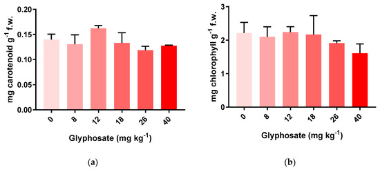 Photosynthesis, one of the main biochemical processes occurring in photoautotrophic organisms, highly depends on light absorption by chlorophylls and carotenoids. The biosynthesis of these pigments, as well as fatty acids or amino acids, can be affected by GLY exposure [69]. As GLY is an EPSPS competitive inhibitor, it blocks the shikimate pathway, thus compromising the biosynthesis of secondary metabolites, such as quinones and photosynthetic pigments, all compounds involved in the photosynthetic metabolism [70]. Previous studies showed that GLY can impair plastoquinone synthesis, thereby contributing to a lower production of carotenoid precursors [50]. Regarding chlorophylls, both GLY and GBH can also directly inhibit its biosynthesis, by reducing δ-aminolevulinic acid (ALA) levels, or increase chlorophyll degradation, as reported by several authors [50,55,71,72,73,74]. Based on these results, it was expected that we would observe a significant decrease in the levels of both chlorophylls and carotenoids. Indeed, even a previous work conducted with the same plant species but grown in perlite and quartz sand [75] reported that the foliar application of a GBH resulted in a reduction in the total photosynthetic pigments as the a.i. concentration increased. However, in the present study, the herbicide showed no effects on chlorophyll and carotenoid contents, despite the slightly lower contents observed when compared to the control group (except for 12 mg kg−1). Thus, these results suggest that, at the tested doses, this herbicide did not negatively affect the photosynthetic pigments as also demonstrated in the study performed by Spormann et al. [65] with a GLY concentration of 30 mg kg−1, applied in the form of Roundup UltraMax® and using a mixture of perlite:vermiculite as substrate. As discussed by Spormann et al. [65], these results could be explained by the lack of (aminomethylphosphonic acid) AMPA production in the artificial medium. Indeed, AMPA, the main metabolite formed upon GLY degradation, is considered as a potent phytotoxin, capable of competing with glycine and consequently inhibiting chlorophyll biosynthesis [76,77]. Thus, there are two hypotheses for the lack of negative effects due to GLY exposure on chlorophyll and carotenoid content: (i) the use of a standard artificial soil with low microbial activity, not allowing enough AMPA production to cause negative effects on biosynthesis of these pigments; (ii) the mode of application of GLY, which, in this study, was added to the soil contrasting to the majority of works which provided GLY as foliar spray. However, and regarding the former hypothesis, this does not mean that an enhanced effect on a natural soil with a more diverse and functionally active soil microbial community would certainly be expected, as the degradation rates of both GLY and AMPA are still not well studied.