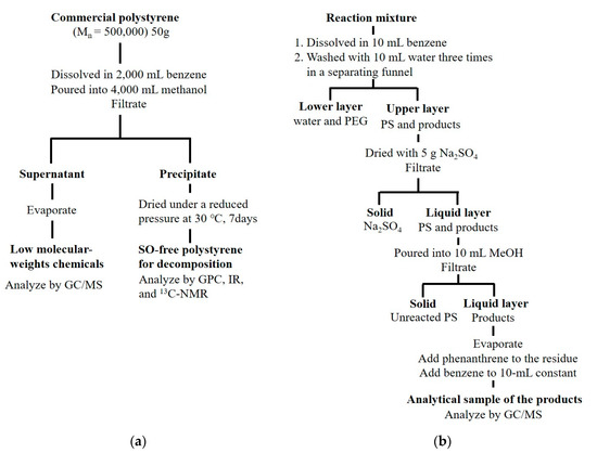 SO-free PS was heated at a fixed temperature for a given period in a flask. The reaction mixture was recovered with 10 mL benzene and was transferred to a 50 mL separating funnel and washed three times with 10 mL purified water to remove PEG. After drying with 5 g anhydrous sodium sulfate overnight, the solution was filtered and transferred to 10 mL methanol to precipitate unreacted PS. The solvent was completely removed from the solution by evaporation at 25 °C and the residue was collected with benzene in a 10-mL volumetric flask. Following the addition of phenanthrene, 1 μL of the solution was injected into GC/MS with a micro-syringe and analyzed. The details are shown in Figure 1b. The GC used was HP6890 (Agilent Technologies, Inc., Santa Clara, CA, USA). The mass spectrometer (MS) was JMS-AMII manufactured by JEOL, Ltd. (Tokyo, Japan) and the separation column was DB-1 manufactured by Agilent J & W. The operating conditions are shown in Table 1.