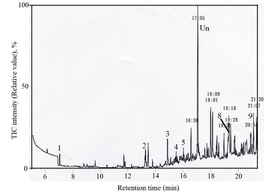 Figure 4 shows the chromatogram of an extraction sample of sand from Waikiki beach at Oahu, Hawaii in 1975 and Figure 5 shows the chromatogram of an extraction sample of pebbles by Showa base, Antarctic Continent in 1984. Compared with the mass fragments of each standard sample, Peak 1 was identified as SM, 3 as diethyl phthalate, 4 as SD1, 5 as SD2, 8 as bisphenol A, 9 as ST. 2 as diphenyl added as a surrogate and 6 as phenanthrene added as an internal standard and Un means unknown chemicals. SM has been shown a breakdown product formed by cinnamon mold flora and possibly may be present in oceans as a single contaminant [25]. However, the other styrene oligomers are not naturally present in ocean. Considering the constant ratio of SM:SD:ST, the authors concluded that SOs have been shown to be the degradation products of PS from land-based sources. The chemical contamination generated from PS had already been present in the nature over 45 years ago.