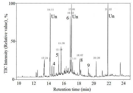 TIM-GC/MS chromatograms of the sample extracted from pebble by Showa base, Antarctic continent, 60°00′ S, 39°35′ E, 1984.