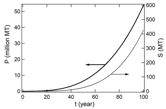 The rate of ST formation was thought same as the rate of PS decomposition at ambient temperatures in oceans and on beaches since PS decomposition at low temperature, 30–150 °C, give ST as the dominant product [22]. The decomposition rate, k, of PS (basically the same as the formation rate of ST) was found to be , where where P0 is the initial amount of purified PS in a flask, t the reaction time and T the temperature in Kelvin. Rate of ST formation was 6.15 × 10−13 min−1. Converting the unit of rate into annual rate, the annual decomposition rate, k, of PS was given as where P0 is the amount of PS in the ocean, t time in years since 1950 and T the temperature in Kelvin. The ST rate was 3.233 × 10−7 year−1 at 30 °C. One MT PS decomposed at a rate of 0.3 g per year at 30 °C. PS production of seven percent in the total plastics production [2]. Jambeck et al. assumed three percent of the total plastic consumption as plastic inflow to the ocean [26]. The cumulative amounts of PS and SOs in the ocean were simulated as shown in Figure 6.