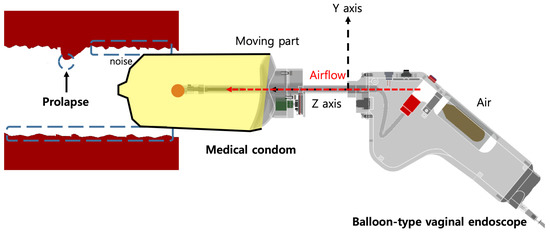 Figure 1 summarizes the requirements needed to satisfy the safe insertion of the vaginal endoscope and a description of how to inflate the rubber material, as the concept design. The part on the left represents the parts that are inserted in the vagina, and the part on the right shows the balloon-type vaginal endoscope. When women feel some symptoms, some prolapses can be found at early stages. This means that there is an abnormality of muscle fiber tissue in that area. If the location and condition of the symptoms are detected at the early stage, it is possible to cope with POP nonsurgical management, such as pelvic floor muscle exercises, pessary insertion, etc. At that time, the device can be used by the patient to observe how symptoms should meet the requirements of (a) safe insertion and (b) exact recognition of the location and condition.