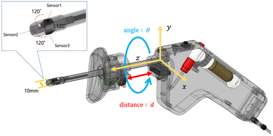where the unit of measurement for is mm, is the constant that is decided by the relation between the offset value for the installation and the tip of the endoscope, and d indicates the measured value acquired by the measuring sensor unit. A distance measuring sensor unit (ST-23G, KOOENSHI Corporation, Republic of Korea) is used, and this sensor is composed of an integrated combination of a position-sensitive detector (PSD, GP2Y0D21YK0F, SHARP Corporation, Japan) that is the infrared-emitting diode (IRED) with signal processing circuit. The allowable range along the z-axis direction is 0–140 mm, and the resolution of this sensor unit is 0.5 mm. This sensor unit is installed in the primary gun-type part.