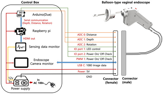 Figure 3 shows the system architecture outside the balloon-type vaginal endoscope. This system can be divided into two parts connected with a 6-pin-type connector, namely, in a control box and an endoscope. The control box plays a significant role in the operation of the endoscope. It comprises one power supply for two types of voltages (direct current (DC) 12 V and DC 5 V), an embedded computer system for processing data acquired by the camera and sensors, and two monitors for the display of data from the camera and sensors.