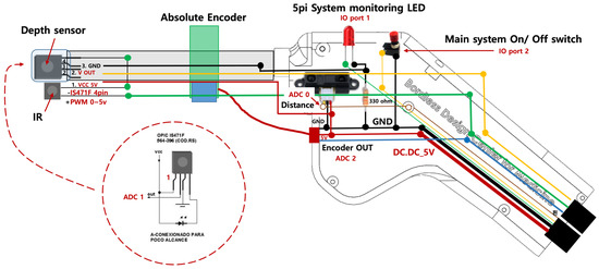 Figure 4 shows the electrical schematic inside the balloon-type vaginal endoscope. All of the electronic components are connected to the control box, which is connected to the handlebar of the endoscope. When the red button is pushed, the light-emitting diode (LED) for system monitoring is on and power is supplied to the system. Data measurements through each sensor are initiated when the power source is supplied and transferred to the Arduino controller. Three depth sensors with infrared (IR) transmitters and receivers are placed at 120 intervals at the tip of the endoscope. The absolute encoder uses the rotating angle of of the endoscope in the range of 0–360 and transforms to a value in the range of 0–1024. Additionally, the distance sensor (PSD sensor) used to obtain the distance of d represents the distance from the original coordinate to the manual moving part (including the absolute encoder). The sampling time for each sensor is set to 100 ms.