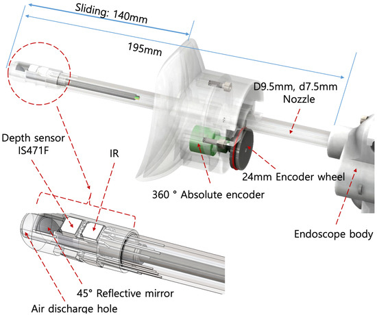 Figure 5 shows the nozzle design of the endoscope. The detailed description of the displacement of all sensors is also shown. The red rubber ring at the encoder wheel is contacted with the nozzle, and the rotated angle is measured. The mirror at the tip of the nozzle enables us to observe the top view of the nozzle. This means that one camera can observe two-directional image data for the front and top views.