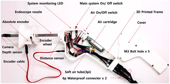 The designed endoscope has the dimensions of distance × height × width = 420 × 175 × 40 mm, and has a total weight of 400 g. The shape is similar to that of the gun intended for sole use. There is an air cartridge with a 16 g size and an air on/off valve inside the handlebar. When the valve is working, the injected air is moved to a nozzle through the connected tube and airflow hole at the tip.