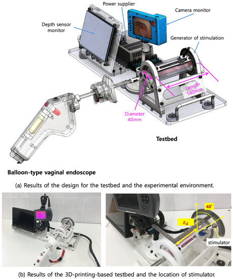 It is necessary to design the testbed to prove the feasibility of the designed balloon-type vaginal endoscope based on the 3D printing technology. Figure 7 shows the results of the design for the testbed based on 3D printing technology to confirm two main points, namely, safe insertion and the ability to acquire exact measurements. Figure 7a,b represents the total experimental environment and the results of the actual 3D-printing-based endoscope and testbed, respectively. At first, the hole diameter was set to 40 mm and the depth length to 140 mm, based on a urologist’s advice, to test the safe insertion. After the rubber material is attached to the manual moving part of the endoscope, the rubber’s air pressure is improved by the red button at the handlebar. Although it is impossible to decide the appropriate internal air pressure for easy insertion in this experiment, this testbed enables us to test whether it is possible to insert the medical-condom-covered endoscope to the depth of 140 mm or not. The problem for the proper internal air pressure should be solved in the future with clinical trials.
