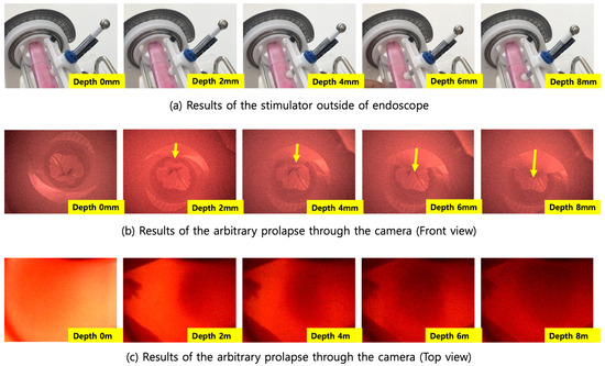 Figure 8 shows the results of the observed arbitrary prolapse through the camera, subject to the condition wherein the stimulator is forced from the outside of the endoscope: (a) shows the results of the stimulator outside the endoscope, and (b) and (c) show the results of the arbitrary prolapse through the camera (front and top views, respectively). It was found that the small arbitrary prolapse was observed by the camera even if there was a 2 mm prolapse.