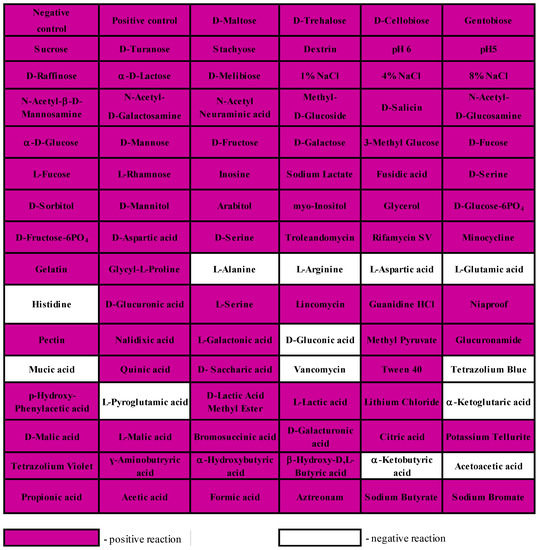 The results of a metabolic activity test analyzing the chemical sensitivity of an environmental Carnobacterium maltaromaticum probiotic isolate and its ability to utilize different carbon sources (GEN III MicroPlate™). Purple color—metabolic activity of the C. maltaromaticum isolate, white color—no metabolic activity of the C. maltaromaticum isolate.