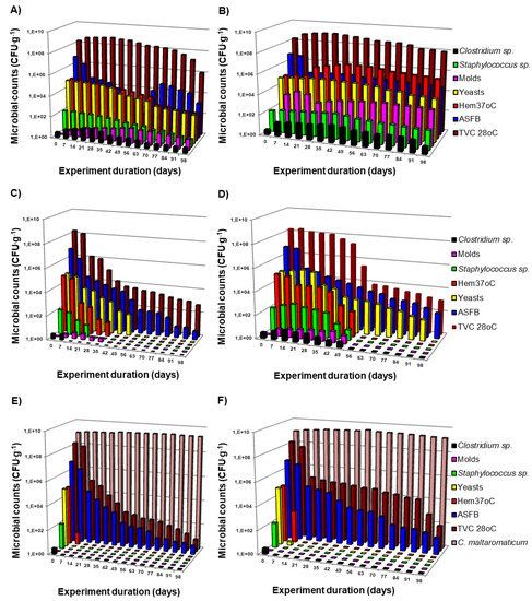 All feed samples (CF, AF, and ACF) stored at 4 °C and 20 °C were subjected to microbiological analyses after 7, 14, 21, 28, 35, 42, 49 56, 63, 70, 77, 84, 91, and 98 days of the experiment. The following parameters were determined: Total counts of C. maltaromaticum bacteria on tryptone soya agar (TSA; Oxoid, Basingstoke, UK) with the addition of 3% yeast extract and 1.5% (w/v) NaCl [14], total counts of mesophilic bacteria on tryptone soya agar (TSA; Oxoid, Basingstoke, UK) incubated at 28 °C for 48 h (TVC 28 °C), total counts of hemolytic mesophilic bacteria on tryptone soya agar (TSA; Oxoid, Basingstoke, UK) with 5% addition of defibrinated sheep blood incubated at 37 °C for 48 h (hemolytic mesophilic bacteria (Hem) 37 °C), total counts of aerobic spore-forming bacteria (ASFB) on an agar/broth medium (Biocorp, Warsaw, Poland) with glucose incubated at 28 °C for 72 h, counts of Staphylococcus sp. bacteria on the Chapman medium (Merck KgaA, Darmstadt, Germany) incubated at 37 °C for 48 h, counts of sulfite-reducing anaerobic spore-forming Clostridium sp. bacteria on the Wilson-Blair medium (Merck KgaA, Darmstadt, Germany) incubated at 37 °C for 18 h, and total yeast and mold counts on the Rose-Bengal-Chloramphenicol Agar (RGBC; Merck KgaA, Darmstadt, Germany) incubated at 28 °C for 5 days.