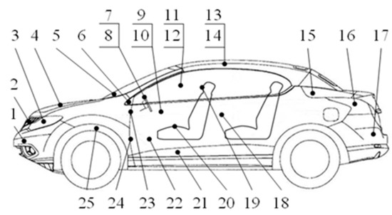 The natural environment parameters outside the car were monitored in real-time by a small weather station; the surface temperature of the parts and the microenvironment parameters inside the automobile were measured by the temperature and humidity sensors as well as the radiometers. Meanwhile, the test parameters were gathered by the PC-2WC data collector at a frequency of 5 min. The main test equipment and measurement parameters are shown in Table 1. Twenty-five sensor measuring points were arranged on different types of auto-parts, as shown in Figure 1, among which there were 10 temperature measuring points on the exterior surface of the car, including (numbers refer to Figure 1): (1) front bumper; (2) radiator grille; (3) right headlights; (4) engine cover; (5) triangular plate of right rearview mirror support; (9) exterior door; (13) the center of exterior roof; (16) rear right lights; (17) rear bumper; and (25) right front wheel shield. There were 13 measuring points on the interior surface of the car: (6) dashboard; (7) steering wheel; (8) airbag cover; (10) interior door; (14) interior roof; (15) rear windowsill; (18) interior trim panel on B-pillar; (19) headrest; (20) seat; (21) carpet; (22) central console; (23) cigar lighter cover; and (24) lower dashboard decoration panel. The air temperature and humidity parameters in the micro-environment of the cabin were collected by measuring Points 11 and 12, respectively. Sensors on typical measuring points were installed as shown in Figure 2.