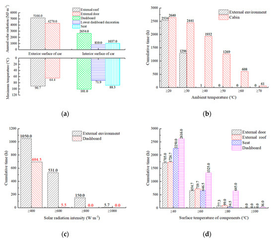 Annual statistical overview of the weathering external factors distribution inside and outside the automobile in non-uniform thermal environment: (a) annual radiation and maximum temperature of parts; (b) ambient air temperature and cumulative time; (c) solar radiation intensity and cumulative time; and (d) surface temperature and accumulated time of parts.
