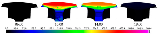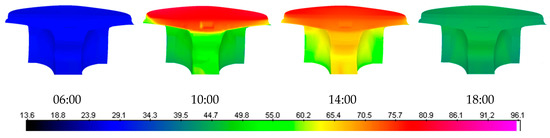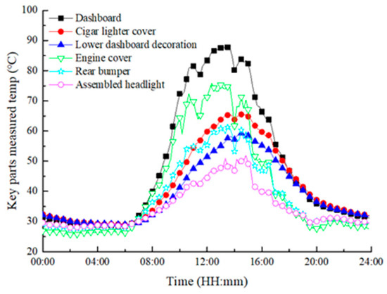 The test data of a typical sweltering summer day were selected from the whole year. As shown in Table 2 and Figure 4, the surface temperature of automobile presents a highly non-uniform distribution phenomenon. On the one hand, there are great differences in the surface temperature of different parts, among which the dashboard temperature is as high as 87.8 °C, while the maximum temperatures of the shielded cigar lighter cover and lower dashboard decoration are merely 65.6 and 59.3 °C, respectively. On the other hand, diurnal temperature differences of the parts are very remarkable, among which those of cigar lighter cover and lower dashboard decoration are just 36.6 and 30.2 °C, respectively, while that of dashboard is up to 59.3 °C.