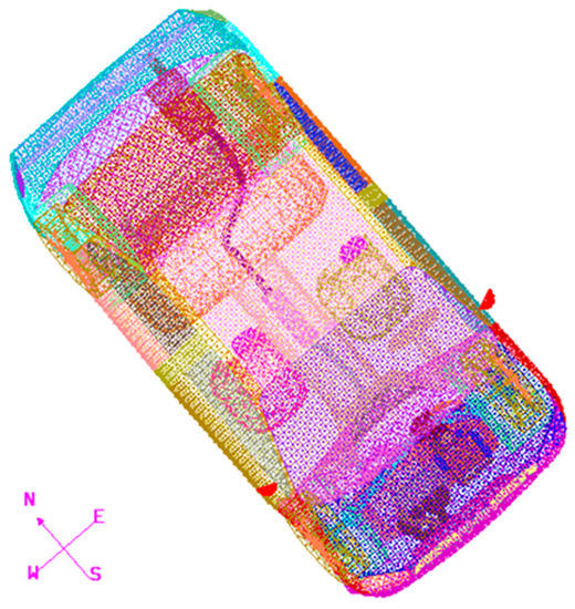 The size of the model corresponding to the test car is 3.9 m × 2.1 m × 1.5 m, and the material physical parameters of each part are given according to the references and databases [45,46,47,48]. The discrete model and physical property parameters are shown in Figure 5 and Table 4, respectively. The environmental weather parameters such as solar radiation, air temperature, wind speed, wind direction and atmospheric pressure continuously monitored in the natural exposure test, as well as the geographical parameters such as longitude, latitude, time zone and altitude where the test site is located, are taken as the definite solution conditions of the heat transfer model. Combined with the dynamic heat transfer Equations (1) and (10)–(13) in the above composite heat transfer model calculation method, the compound heat transfer process of the model is analyzed in detail, including the radiation, conduction and convective heat transfer, and then the dynamic simulation temperature of the complete car during day and night is calculated in real time. In the process of calculation, the discrete model and dynamic environment parameters are corrected in real time until the dynamic simulation results are consistent with the experimental data.