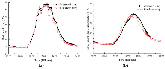 The simulation verification and relative error analysis of key parts inside and outside the car are shown in Figure 6. The numerical simulation values of key parts, such as dashboard, lower dashboard decoration, bumper, engine cover, etc., are all highly consistent with the temperature values in the diurnal dynamic test, and the relative errors of some measured points are even less than 5%.