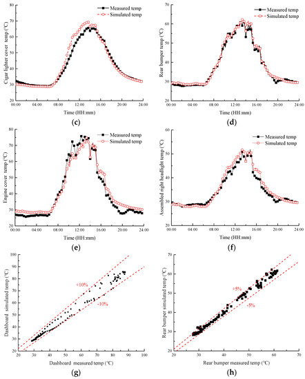 Comparison and verification between dynamic simulated and measured temperature of key parts: (a) dashboard temperature; (b) lower dashboard decoration temperature; (c) cigar lighter cover temperature; (d) bumper temperature; (e) engine cover temperature; (f) headlight temperature; (g) relative error of dashboard temperature; and (h) relative error of rear bumper temperature.