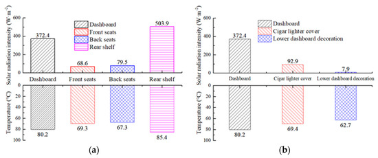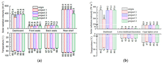 To study the methods of reducing intensity of the local weathering external factor, the glass transmittances of front windshield, side front window, side rear window and rear window were decreased, respectively. As shown in Table 6 and Figure 12, the transmittance of the front windshield in Project 1 is reduced by 0.2. Viewed from the horizontal direction in the cabin, the amplitude reduction on both solar radiation and temperature of the main auto-parts from large to small are arranged as dashboard, front seats, rear seats and rear windowsill, respectively. In the vertical direction, it is found that amplitude reduction on weathering external factors from high to low are dashboard, cigar lighter cover and lower dashboard decoration, respectively. At the same time, the thermal gradient between different types of parts decreases correspondingly, among which the solar radiation gradient and temperature gradient between dashboard of Type I part and lower dashboard decoration of Type II part are reduced from 364.5 W·m−2 and 17.5 °C to 286.5 W·m−2 and 14.7 °C, respectively. Thus, it can be seen that the influence of reducing windshield transmittance on the weathering external factor intensity of parts decreases with the increment of distance between windshield and parts, and similar rules can also be obtained for the remaining three projects through reducing transmittance of other window glasses. Therefore, for the parts with high intensity of weathering external factors in the local regions of cabin, the transmittance of the window glass close to these parts can be reduced pertinently, so as to realize the regulation and control on the local external factors of weathering.