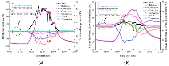 Diurnal variation rules on weathering external factors and heat transfer of different types of parts: (a) Type I part (dashboard); and (b) Type II part (lower dashboard decoration).