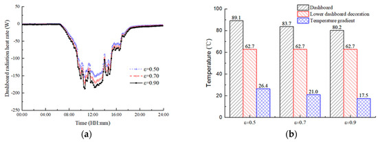 Influence of emissivity on regulation of heat transfer and temperature gradient: (a) radiant heat dissipation of dashboard; and (b) maximum temperature and temperature gradient.