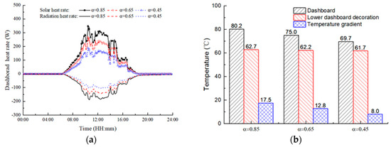 As shown in Table 7 and Figure 14, for each 0.2 decrease in surface absorption, the solar radiation heat rate absorbed by the dashboard reduces by up to 79.1–80.7 W, whereas the radiation heat dissipation rate reduces by only 42.0–42.1 W. Since the amplitude reduction of solar radiation heat absorption is greater than that of radiation heat dissipation, the dashboard temperature drops by 5.2–5.3 °C. In terms of diurnal temperature difference, as the absorptivity reduces from 0.85 to 0.65 and 0.45, respectively, the diurnal temperature difference of the dashboard decreases from 51.6 to 46.4 and 41.1 °C, respectively. Meanwhile, the temperature gradient between dashboard and lower dashboard decoration decreased from 17.5 to 12.8 and 8.0 °C, respectively.