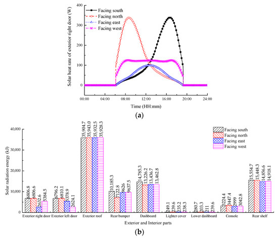 Influence of orientations on the distribution and cumulative values of auto-parts weathering external factors: (a) the all-day solar heat rate on the exterior right door; and (b) distribution and cumulative values of solar radiation energy on exterior and interior parts.