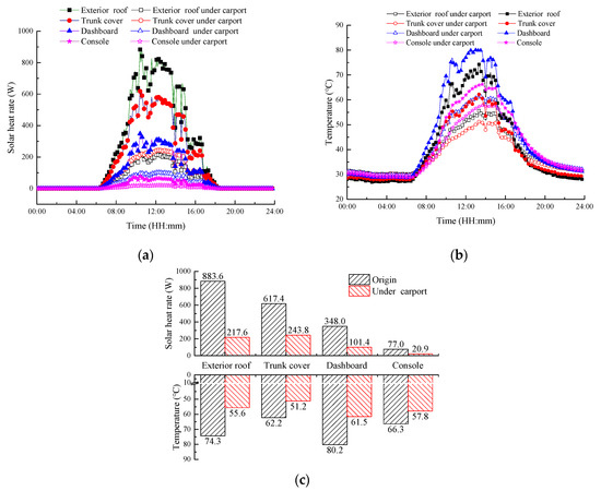 The comparison of automobile weathering external factors on the conditions of carport and outdoor location: (a) the all-day solar heat rate on the exterior and interior parts; (b) the all-day temperature on the exterior and interior parts; and (c) the difference of weathering external factors under the conditions of carport and outdoor.