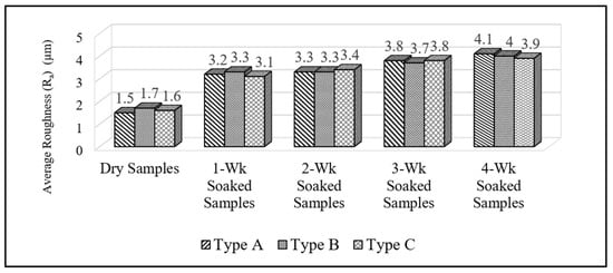 Figure 3 illustrates the average roughness values of dry and water-exposed samples. An Ra value of 1.5 µm was found for the control samples with no clay content. Control specimens manufactured with 3% and 6% clay did not show any significant difference in their Ra values as compared to those made with no clay, as can also be seen in Table 1. It seems that a one-week water soaking adversely influenced the overall surface quality of all samples to a noticeable level. As can be observed in Table 1, the Ra values of sample Types A, B, and C were found to be 3.2 µm, 3.3 µm and 3.1 µm, respectively. As it is well known that wood is a hygroscopic material that is sensitive to moisture, the deterioration of the roughness of the samples soaked in water, even for one week, could easily be related to having 50% eastern redcedar particles in the polymer compound. Once the samples were exposed to water for an extended time, sequentially 3 and 4 weeks, the magnitude of the surface deterioration of the samples gradually decreased. For example, sample Type C with 6% clay had an Ra value of 3.8 µm as a result of the 3-week water soaking and this value increased by only 2.56% when it were kept in water for one more week. It appears that having clay in the samples created some kind of barrier so that water diffusion in the polymer matrix was reduced [,]. In a previous study, the surface roughness of pressed WPC samples was evaluated and the Ra and Rz values of the specimens ranged from 1.98 µm to 4.48 µm and 16 µm to 33 µm, respectively []. Based on the findings in this work, no significant difference was detected between the average roughness (Ra) values of the samples with two different clay contents. The mean peak-to-valley height (Rz) results of the samples followed the trend of the Ra values for all types of specimens. It appears that a long period of water soaking for the samples reduced their surface quality insignificantly, suggesting that possibly a coating or certain type of treatment can be applied to the surface of WPC panels so that their service life can be extended with better utilization.