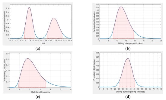 Travel behaviour: (a) daily starting trip time; (b) kilometres travelled per day; (c) number of trips per day; (d) trip duration.