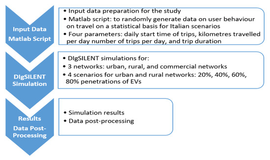 The following sub-sections will provide details on the case study definition, charging and base load profiles, battery energy storage system (BESS) and PV models and, control strategies. The impact of charging systems for EVs on the distribution networks is considered and described assuming the reference scenario of year 2030. Domestic charging modelled through home stations and the related impact on transformers and feeders will be simulated, considering the circulating electric vehicles will range from 20% to 80% of the total car fleet, as well as fast charging with fast-charging stations.