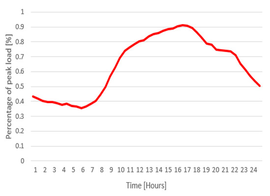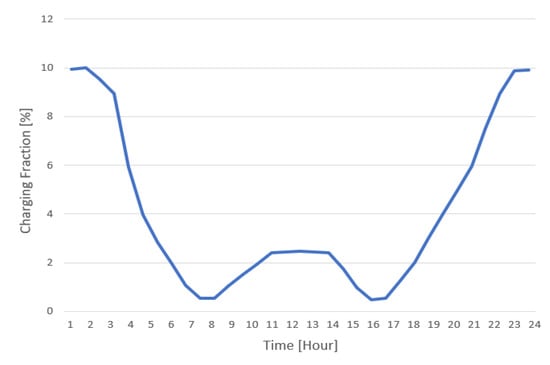 To assess the impact of the diffusion of EVs on the electricity distribution networks, the load diagram was added to the average charging profile of the EV fleet. The profile in Figure 3 indicates the power required by the distribution network in percentage terms with respect to the total power of the batteries installed on the EVs, which recharge on the considered LV network.