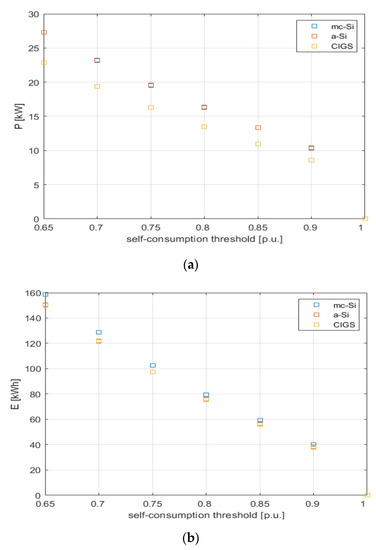 The CIGS (copper indium gallium (di)-selenide, compound semiconductor) technology allows the lowest power difference and energy excess given a certain self-consumption threshold, which are respectively equal to 23 kW and 150 kWh for a SC = 0.65.