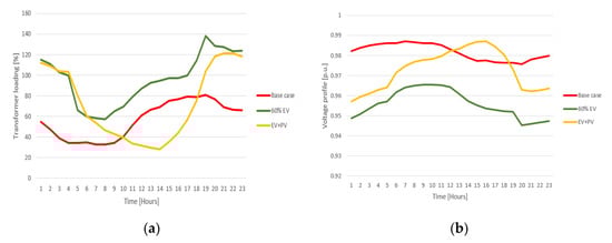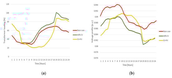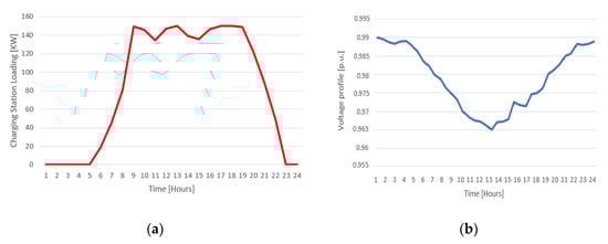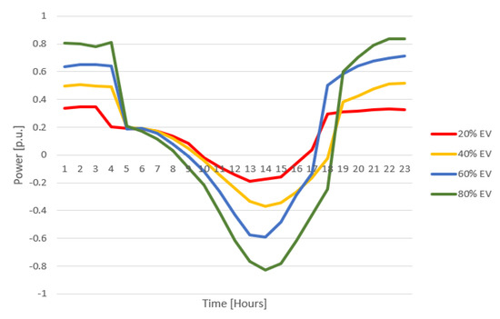 The basic scenario was created starting from the data obtained by the historical Italian consumption data on the Entso-e platform [56] and scaled to reproduce a typical residential load curve which represents a usual scenario for an urban network. The base case load has the classic working day characteristic, so for simplicity has been assumed as a single profile, without distinctions between working days and holidays, while as regards the distribution of EV connections to the network, it has been assumed that there will be a greater concentration of recharge during the night from 6:00 p.m. and a lower concentration of recharge in the time intervals in which the movements are more common, therefore, between 7:00 a.m. and 9:00 a.m. and between 3:00 p.m. and 5:00 p.m.