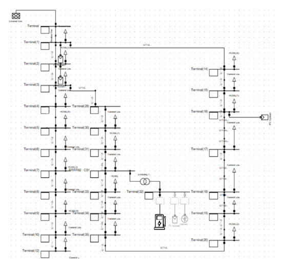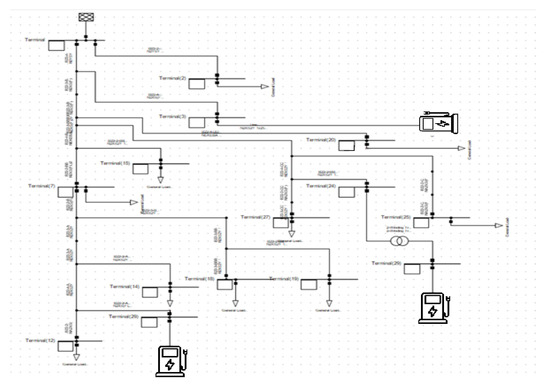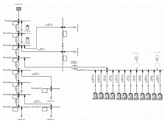 The simulations were performed using DIgSILENT® PowerFactory (Gomaringen, Germany), which is a calculation program for the analysis of extensive electrical systems, as well as industrial and commercial electrical systems. It has been designed as an integrated software dedicated to the analysis and control of electrical power systems in order to achieve the main objectives of optimising planning and operation [55]. The choice of DIgSILENT software derives from the fact that it enables a faithful reproduction of any type of network with a high degree of detail and also ensures great flexibility. The database used by DIgSILENT contains all the data necessary for all the devices within the electrical system (for example lines, transformers, generators, protection data), which eliminates the need to create specific models for any type of analysis (load flow, dynamic studies).