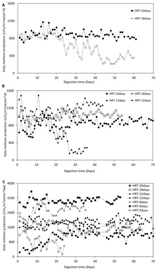 Daily methane productions (production rates as LCH4/m3 reactor*day) in the three SSTR digesters at different hydraulic retention times. (A) SBB, (B) SBB + CM, and (C) SBB + PM.