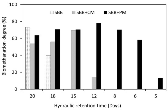 It can be observed that for SBB single digestion and at the optimum HRT of 20 days, a high biomethanation degree of 73% was obtained. The SBB substrate required a long time for its degradation (high HRT), and decreasing this time led to reaching low substrate biodegradability. Moreover, in both co-digestion assays, above 60% of biomethanation degree was achievable at the different HRT studied, excepting at the critical HRT tested in each experiment: 5-day HRT in SBB + PM (BD was only 13%) and 12-day HRT in SBB + CM (BD was only 14%). The highest value of the BD was around 78% in the reactor of SBB+PM at the HRT of 12 days. These results demonstrated that co-digestion played an important factor in wastes degradation likely due to the synergistic effect created in digesters, being PM more suitable to improve the biodegradability of the digester content than CM.