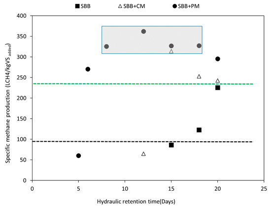 Aiming for a comprehensive comparison of the obtained methane productions in the present research, the criterion developed by Smith and Mah [38] has been applied to the results. Thus, specific methane productions (SMPs) for the three semi-continuous digesters are depicted in Figure 3. The highest SMP from SBB+PM (HRT from 18 to 8 days) and the highest SMP from SBB+CM (HRT of 15 days) have been selected as representatives of the optimal operation area (the blue box). The average value of the five data of SMPs was 331 LCH4/kgVSadded. The black discontinuous line in the figure corresponded to the SMP value of 27% of the average SMP obtained (89.5 LLCH4/kgVSadded). The green line corresponded to the SMP value of 73% of the average SMP obtained (241.8 LCH4/kgVSadded).