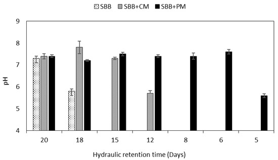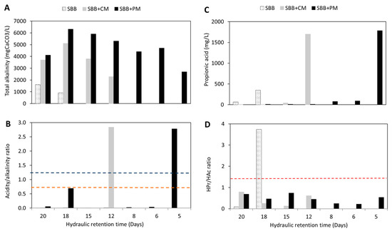 It has been reported that the ratio acidity to alkalinity is useful as an indicator of anaerobic reactor stability [43,44,45]. Thus, values above 0.8 predict the reactor instability. Values below 0.4 indicate proper operation and values with a range of 0.4–0.8 predict that the operating conditions are at the tolerance limit for microorganisms in which the destabilization of the system started. In this sense, it has been corroborated that at HRTs of 18 days, 12 days, and 5 days, respectively for SBB, SBB+CM, and SBB+PM reactors, the tolerance limit of microorganisms was altered and a lack of buffer capacity to neutralize the VFAs released occurred.