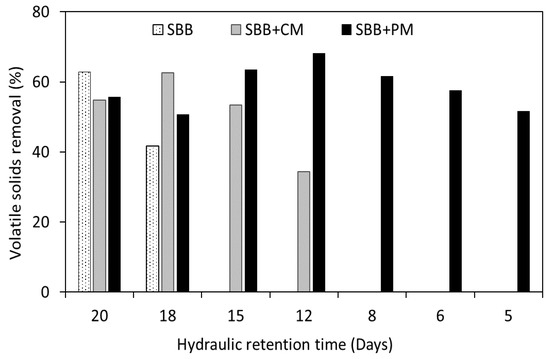 In the SBB digester, operation at a lower HRT (higher OLRs) of 18 days led to a decrease in the efficiency of the organic matter removal. In the SBB+PM reactor, the decrease in VS removal was gradual from 12-day HRT to 5-day HRT. The same behavior was observed in the SBB+CM reactor, with a gradual decrease from 18-day HRT until 12-day HRT.