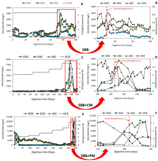 Evolution of the dissolved organic carbon (DOC) and indirect parameters in the three SSTR. The detailed figures of failure operation periods for each digester are illustrated on the right. (A,B) SBB digester; (C,D) SBB+CM digester; (E,F) SBB+PM digester.