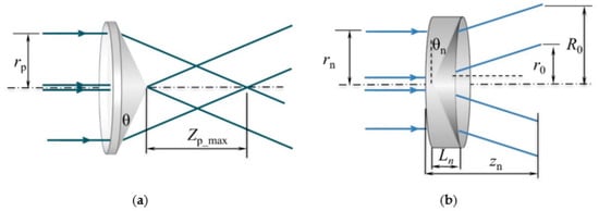 An axicon can continuously converge the light to different positions along the axis, and it is widely used to produce nondiffracting beams. There are two types of axicons: a positive axicon and a negative axicon, as shown in Figure 1. From the view of geometrical optics, it can be seen that the positive axicon has a convergent effect on the beams, and the negative axicon has a divergent effect on the beams within a certain range of transmission distance.