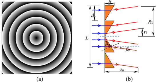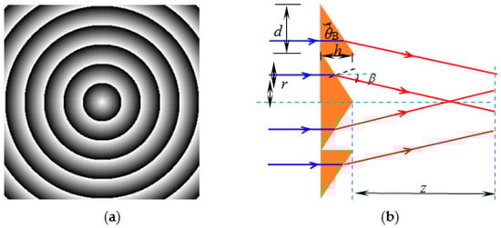 Although the ideal real axicon can effectively generate nondiffracting Bessel beams, the fabrication errors will influence the quality of nondiffracting beams. Therefore, an easy-to-process method is put forward. The method is loading the CGHs to the SLM to achieve the phase modulation of the incident beam. The hologram for simulating the positive axicon is present in Figure 2a, and Figure 2b is the central profile of the hologram. From Figure 2b, the profile can be looked at as an assembly of equally spaced grooves, and d and h are the period and the height of the grooves, respectively.