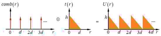 Because the hologram has circular symmetry, we take half of it to analyze. The transmittance function of the hologram can be looked at as the convolution between t(r) and Dirac comb function comb(r), as shown in Figure 3 [].