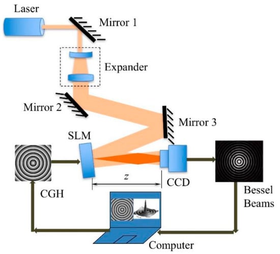 - Chattrapiban, N.; Rogers, E.A.; Cofield, D.; Hill III, W.T.; Roy, R. Generation of nondiffracting Bessel beams by use of a spatial light modulator. Opt. Lett. 2003, 28, 2183–2185. [Google Scholar] [CrossRef] [PubMed]