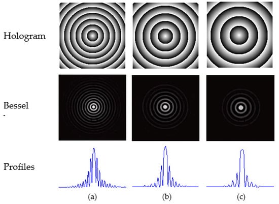 Equations (2) and (20) represent the intensity distribution of an incident beam passing through the real axicon and the SLM-loaded holograms, respectively. Comparing Equations (2) and (20), if θ = h/d, ω0 = ω and I0 = A2, the two equations are exactly the same. Therefore, we can use the hologram to simulate the positive axicon to generate zero-order Bessel beams (also called nondiffracting beams).