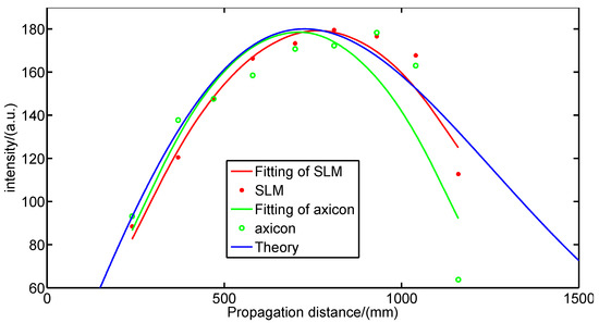At the same time, we compared the axial intensity distribution of the Bessel beams generated by these two methods. Some other parameters of the holograms and the incident beams are given by n1 = 1.51637, ω = 6 mm, λ = 650 nm, and I0 = 1. Table 1 presents axial intensity distributions of Bessel beams of theory (calculated by Equation (20)), generated by the SLM and the real axicon within the zmax, and their varying trends and fitting curves are shown in Figure 8. From Table 1 and Figure 8, we can see that the axial intensity distributions of the SLM are well matched with the theoretical analysis. The distributions of the real axicon are consistent with the theoretical analysis in the near distance, but it began to deviate from the theoretical value after the peek. The reason for the deviation is the deformation of the Bessel beams due to the manufacture errors. This also proved that the axial intensity distributions are affected by the manufacture precision of the axicon.