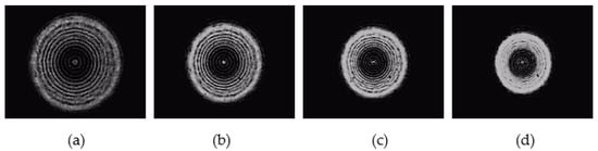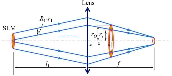Negative axicons can generate annular beams, which can be applied in laser drilling to improve the efficiency [,]. Since demonstrating the SLM can also produce the annular beams with the CGHs, experiments were carried out with the same experimental setup in Figure 5 by adding a lens (focal length f = 110 mm). From Figure 4b, it can be seen that the beams from the SLM have a divergence angle, and its distribution area will exceed the receiving size of the CCD. Therefore, the lens was used to converge the beams and guarantee that the CCD will capture them, as shown in Figure 9. The hologram used to simulate the negative axicon, as shown in Figure 4a, was loaded into the SLM, and the period was set as d = 15 pixels, the distance from the SLM to the lens l1 = 230 mm, and the height of the grooves h = 0.0012 mm.