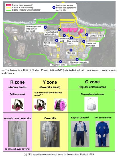 Decommissioning of Fukushima Daiichi NPS is challenging work that has never been done before, which presents industrial and chemical hazards as well as radiological ones, and indeed these hazards generally present high risk to workers [1]. At present, many TEPCO workers, nuclear reactors manufacturers, construction companies, and their contractors are engaged in the decommissioning project for the Fukushima Daiichi NPS and are consequently exposed to various health risks. At present, the Fukushima Daiichi NPS site is divided into three zones (see Figure 1a), and workers are instructed to wear proper Personal Protective Equipment (PPE) when working in different zones (as illustrated in Figure 1b [2]). The designated zones (and the associated PPE) are listed below.