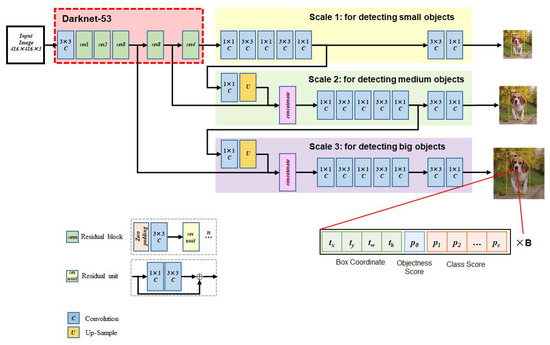 In 2018, Redmon et al. proposed YOLOv3 [5] as an improvement of the YOLO family. As demonstrated in Figure 4, YOLOv3 uses a deep network architecture with residual blocks and a total of 53 convolutional layers, i.e., Darknet-53, for feature extraction, which has better performance and is faster than ResNet-101 [21]. Drawing on the idea of feature pyramid networks [22], YOLOv3 makes predictions at three scales (“predictions across scales”) by downsampling the size of the input image by 32, 16, and 8. This means, with an input of , the YOLOv3 model provides feature maps of , , and , respectively, in three output layers.